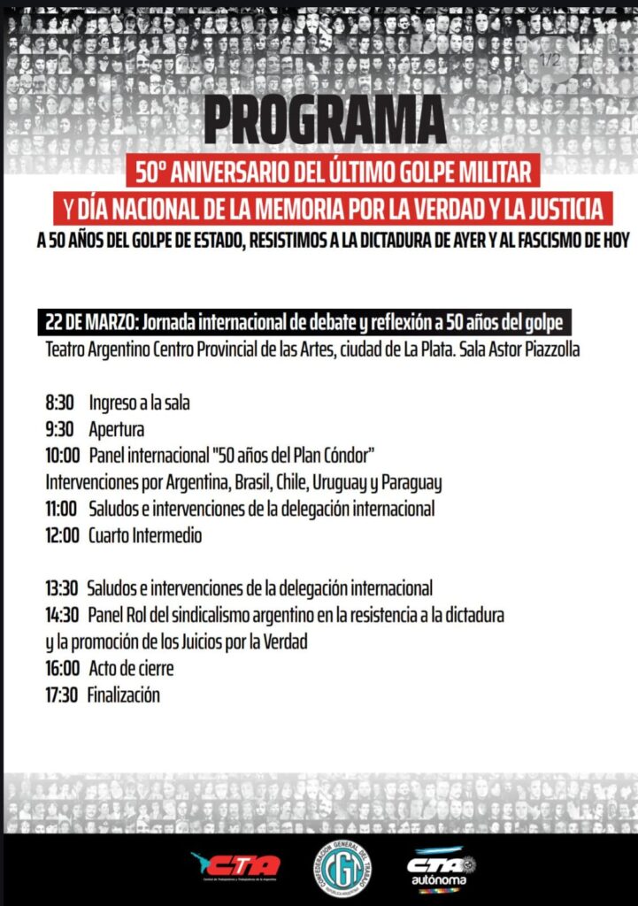En el marco de la Semana del 50° aniversario del último golpe militar y del Día Nacional de la Memoria por la Verdad y la Justicia, las tres centrales sindicales (CTA Autónoma, CTA de las y los Trabajadores y CGT) realizarán un encuentro internacional el próximo 22 de marzo en la ciudad de La Plata, con la participación de 60 delegados y delegadas de 20 países de América Latina, Europa y Oceanía.